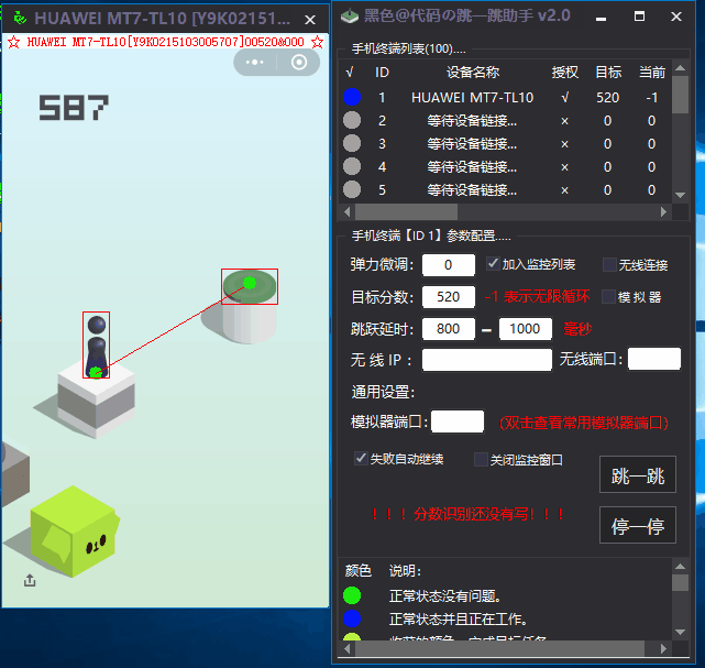 支持使用USB、WIFI无线、以及模拟器 、多设备连接跳跃,设置好弹力微调参数几千分没问题