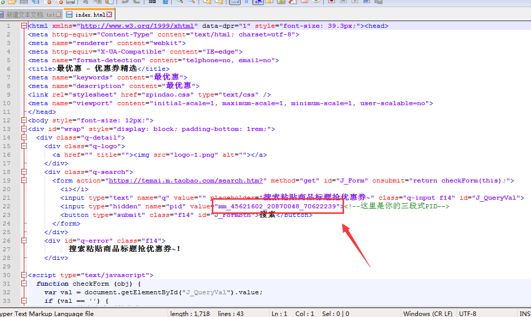 请使用编辑器(如:notepad++ 或 EditPlus)编辑 index.html文件,代码找到22行,修改为你的pid即可。