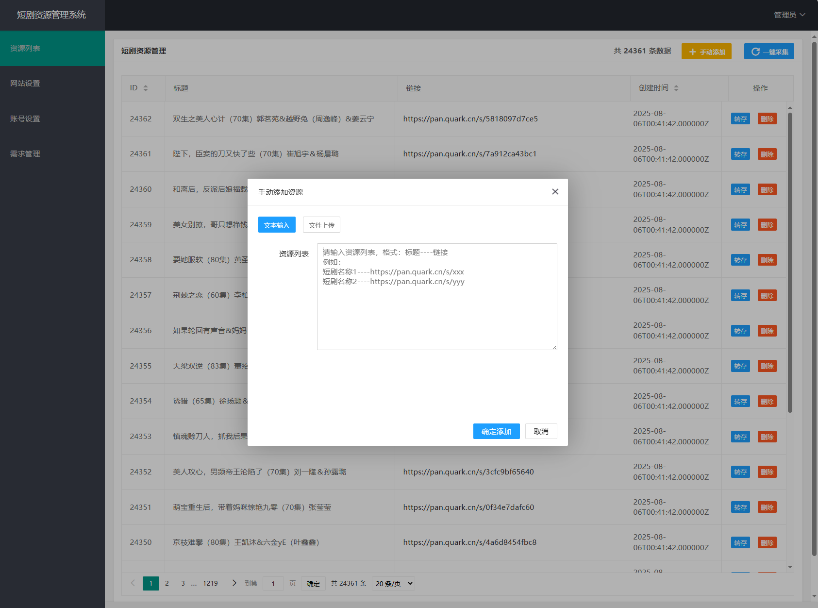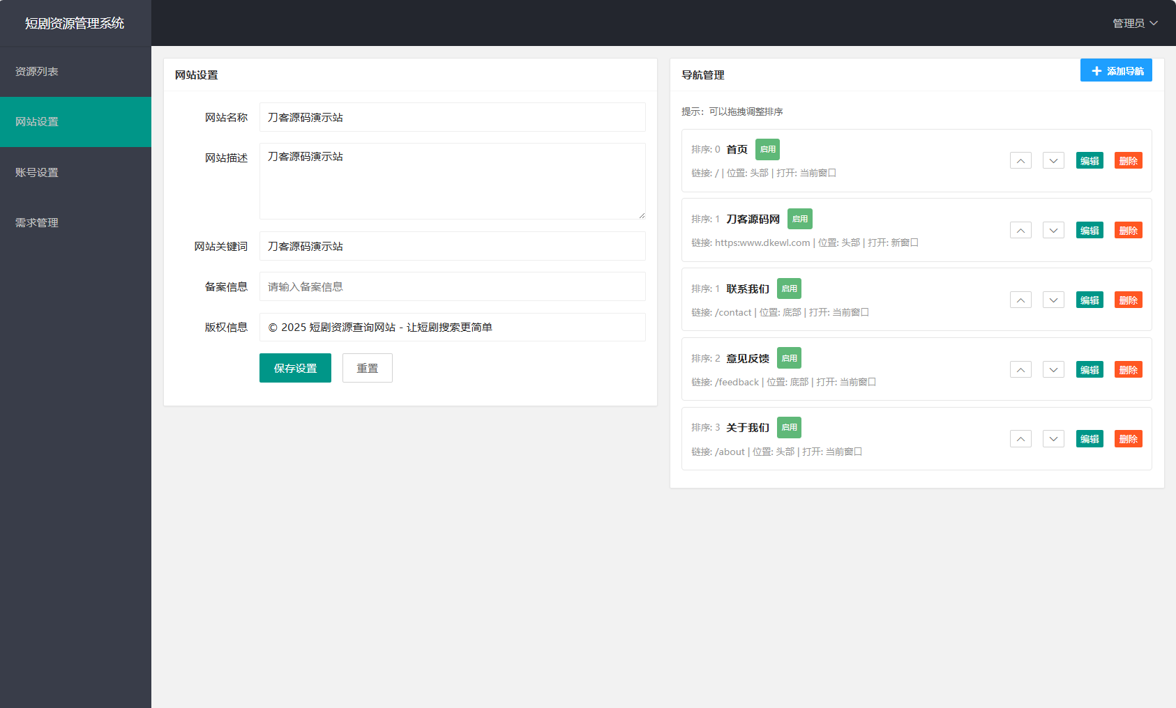 网盘短剧资源转存项目源码 支持夸克 带后台 附教程柚子3天前更新关注06425网盘短剧资源转存项目源码 支持夸克 带后台 附教程此内容为免费资源,请登录后查看柚币0 登录查看免费资源 简介: 网盘短剧资源转存项目源码 支持夸克 带后台 附教程 安装教程: 测试环境:Nginx + PHP7.4 + MySQL5.7 数据库信息配置文件:.env 网站运行目录设置为:public 图片: © 版权声明 文章版权声明 1、本网站名称:晨瑞资源 2、本站永久网址:https://www.shksx.com/ 3、本网站的文章部分内容可能来源于网络,仅供大家学习与参考,如有侵权,请联系站长QQ476187086进行删除处理。 4、本站一切资源不代表本站立场,并不代表本站赞同其观点和对其真实性负责。 5、本站一律禁止以任何方式发布或转载任何违法的相关信息,访客发现请向站长举报 6、本站资源大多存储在云盘,如发现链接失效,请联系我们我们会第一时间更新。 THE END其他活动 喜欢就支持一下吧点赞25 分享QQ空间微博QQ好友海报分享复制链接收藏